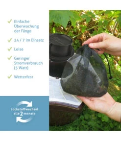 Die Verwendung der Biogents BG-Mosquitaire Mückenfalle ist denkbar einfach. Alles, was Sie dafür tun müssen, ist, sie an einem passenden Ort aufzustellen, anzuschließen, das Duftsäckchen einzulegen und in Betrieb zu nehmen. Ideale Aufstellorte finden sich neben einem Busch, wo Stechmücken typischerweise rasten oder an einer Stelle mit hoher Luftfeuchtigkeit. Lassen Sie das Gerät nun durchgehend laufen, es ist leise, wetterfest und braucht wenig Strom. Das Beste: es deckt eine Fläche von ca. 600 m² ab!