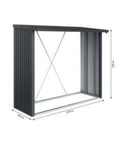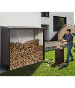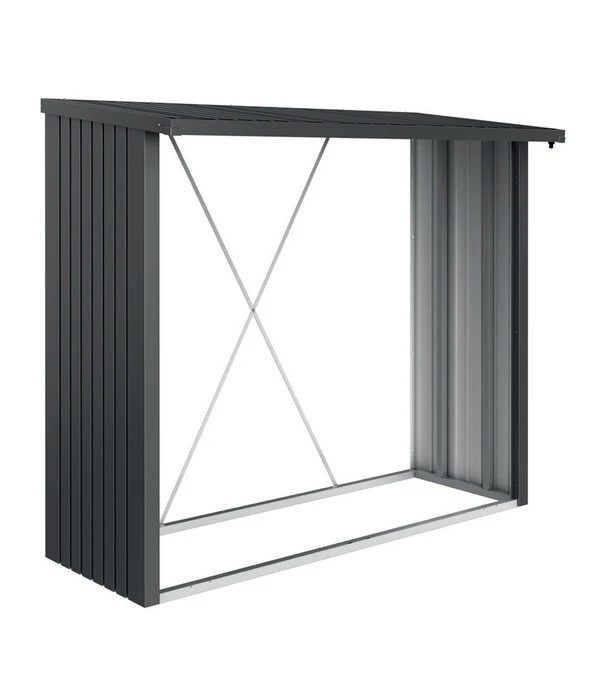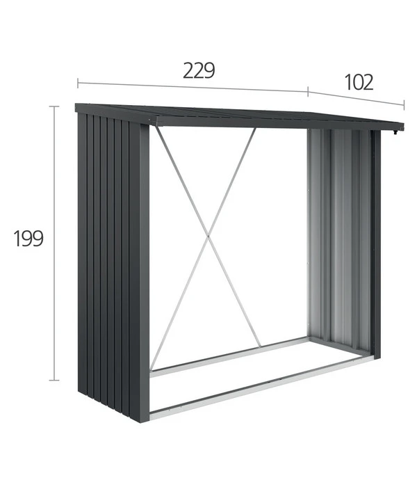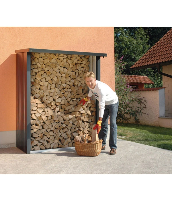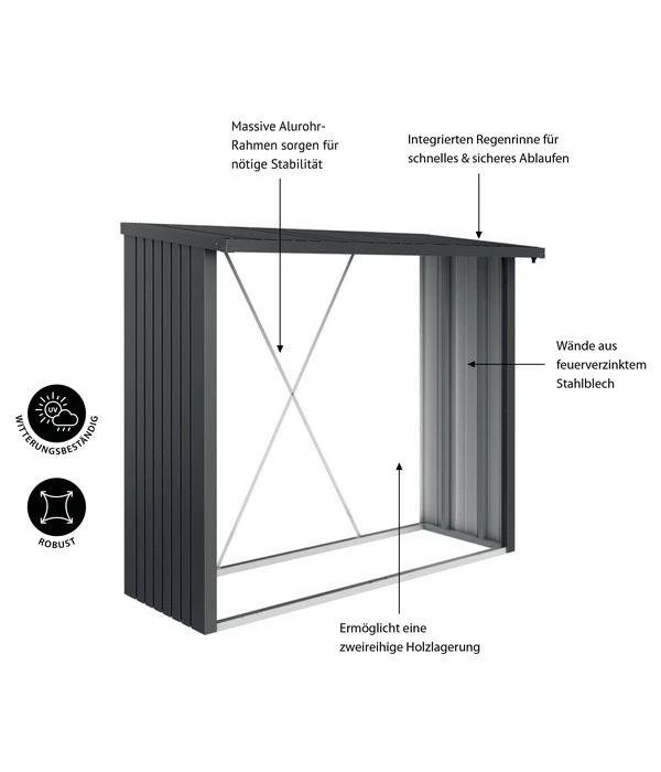 Ein Kamin ist nur so gut, wie das Holz, mit dem er befeuert wird – und das muss den richtigen Trocknungsgrad haben. Im WoodStock® von Biohort können Sie Ihr Kaminholz vor Feuchtigkeit geschützt sicher aufbewahren und so eine ideale Trocknung erzielen. Die Abmessungen ermöglichen eine zweireihige Holzlagerung, solange Sie die maximale Länge von 35 cm des Brennholzes beachten. Der Holzunterstand für den Garten verfügt über Wände aus feuerverzinktem Stahlblech, die an einen massiven Alurahmen montiert werden. Dank der integrierten Regenrinne läuft Wasser schnell und sicher vom schrägen Dach ab. Das Raumvolumen beträgt 2,1 m³.