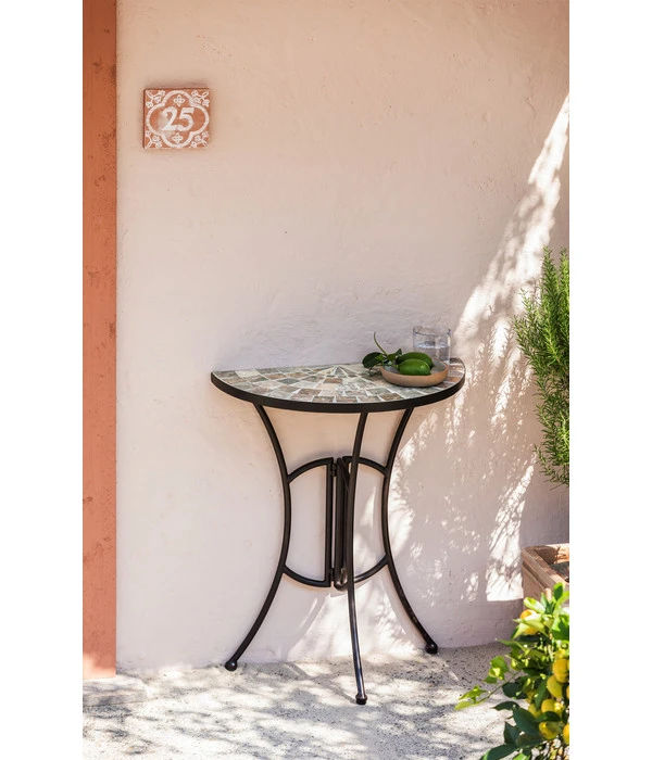 Wünschen Sie sich nicht auch manchmal Ihre Ferien in südländischen Gefilden zurück? Mit dem halbrunden Dehner Mosaiktisch Grazia holen Sie sich das perfekte Urlaubsfeeling auf Ihre Terrasse, den Balkon oder in den Garten. Die mediterrane Optik mit den zauberhaften Mosaiken aus Steinfliesen auf der Tischplatte wird Sie und Ihre Gäste begeistern und macht ihn zu einem echten Hingucker. Aufgrund seiner Form können Sie den Tisch hervorragend an einer Wand platzieren und mit Deko-Objekten ausstaffieren oder beliebig als Ablagefläche oder anderweitig verwenden. Sie werden dieses entzückende Tischchen schnell in Ihr Herz schließen und nie mehr abgeben wollen.