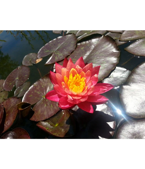 Bei einem Platzbedarf von nur ca. 1 m² eignet sich die Seerose ‘Aurora‘ nicht nur für große Gartenteiche, sondern wird auch kleine Teiche mit einem Durchmesser von 250 cm schmücken und kann sogar in einem Kübel auf der Terrasse kultiviert werden. Dieser sollte allerdings eine Tiefe von mindestens 40-50 cm haben. Darf sich die Seerose ‘Aurora‘ in einem kleinen Gewässer in Szene setzen, sollten Sie die Pflanze aber vor dem Winter herausholen und in einem großen Eimer an einem kühlen, aber frostfreien Raum überwintern.
