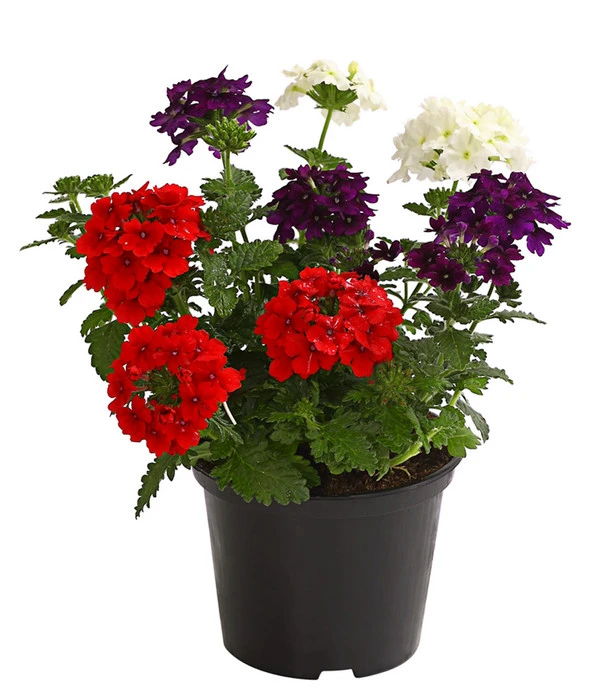 Von April bis in den Spätherbst erstrahlt die Verbene in vielen Farbmöglichkeiten – von Weiß über Rot und Blau bis hin zu zarten Lila- und Rosatönen. Damit bilden die leuchtenden Blüten einen spannenden Kontrast zu den dunkellaubigen Blättern. Mit dem Eisenkraut-Trio holen Sie sich eine exklusive Besonderheit nach Hause: Drei ausgesuchte Sorten der Verbene wurden hier zu einem prächtigen Farbspiel kombiniert, dabei wurde besonders auf einen einheitlichen Wuchs und gleichem Blühverhalten geachtet. Verbenen sind sowohl beliebte Gartenpflanzen, als auch geeignet für die Bepflanzung von Kübeln oder Balkonkästen perfekt geeignet.