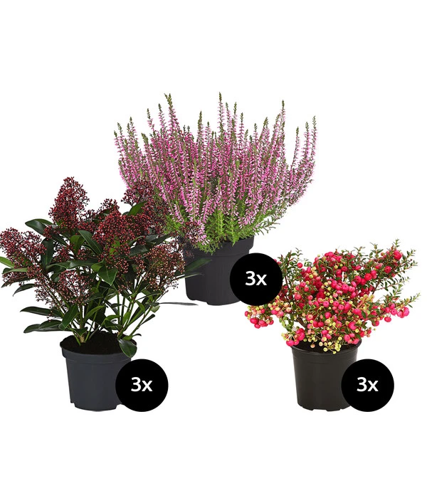 Je 3 x Pernettya, Skimmia und Calluna