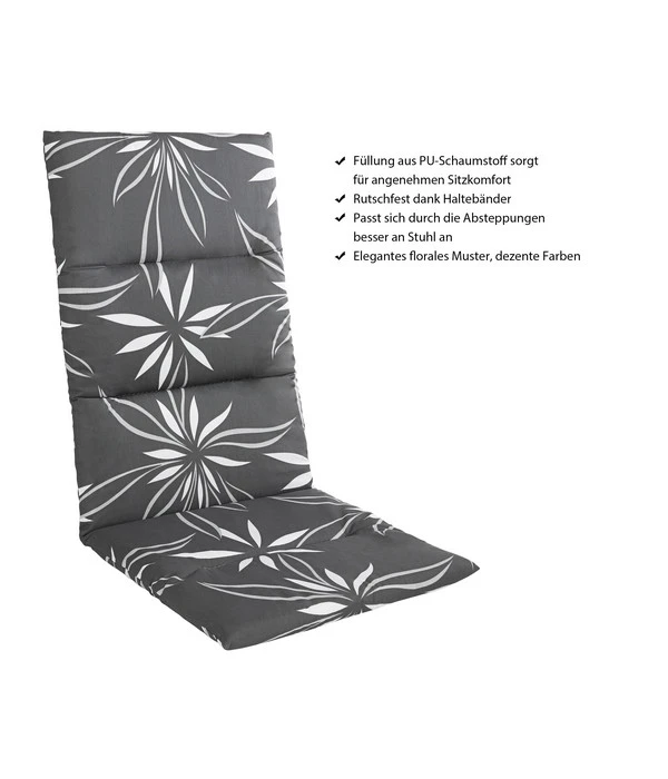 Das Hochlehnerpolster Turin von KETTtex überzeugt durch sein ausgeklügeltes und zeitloses Design. Durch die Querabsteppungen passt es sich dem Stuhl optimal an. Zudem sorgt der schicke Look der Sitzauflage Turin für stylische Akzente: Das schöne florale Muster wirkt besonders elegant. Dank der dezenten Farbgebung lässt sich die Auflage darüber hinaus wunderbar mit anderen Zierkissen oder Textilien kombinieren, sodass Sie das Sitzpolster mühelos in viele Einrichtungsstile integrieren können. Entscheiden Sie sich jetzt für das ebenso trendige wie bequeme Hochlehnerpolster Turin aus dem Sortiment von KETTtex, das zum puren Entspannen im Garten oder auf der Terrasse einlädt.