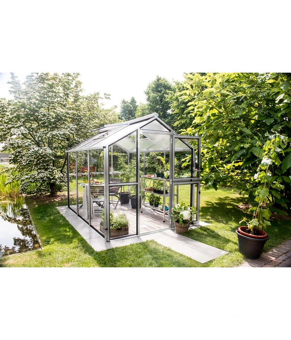 Beim KGT Gewächshaus Galant III besteht das Dach aus ISO-HKP-Hohlkammerplatten in einer Stärke von 10 mm, Giebel und Traufe sind aus 4 mm starkem ESG Sicherheitsglas. Welchen Vorteil hat diese Material-Kombination, fragen Sie? Die Hohlkammerplatten aus Polycarbonat sind leicht, hochbruchsicher und schlagfest und sorgen dank hervorragender Wärmeisolierung für ein stabiles Raumklima gerade zwischen den Jahreszeiten. ESG Echtglas hingegen sieht einfach besser aus und bietet Ihnen den ungestörten Blick ins Haus und vom Haus in den Garten. Kurz: Die Kombi-Verglasung beim KGT Gewächshaus Galant III steht für weiches Licht von oben und freie Sicht an den Seiten.
