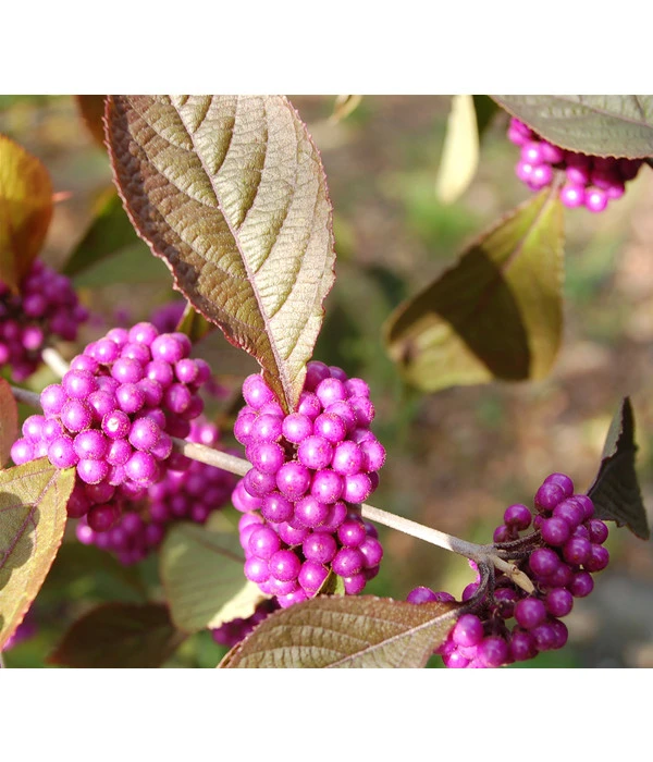 Der Liebesperlenstrauch ‚Profusion‘, auch Schönfrucht genannt, ist ein mittelhoher, sommergrüner Zierstrauch, der im Herbst durch seine leuchtend gelbe Laubfärbung und den außergewöhnlichen Beerenschmuck beeindruckt. Die Blüten der Pflanze zeigen sich von Juli bis August und sind lila-rosa gefärbt. Sie werden gerne von Bienen und Hummeln angeflogen. Ab September erscheinen die glänzenden, violett gefärbten Beeren, die den eigentlichen Zierwert des Strauches ausmachen. Der Fruchtansatz ist deutlich höher, wenn mehrere Sträucher gepflanzt werden. Somit ist auch die Fernwirkung garantiert und staunende Betrachter werden Sie sicherlich auf diesen wunderbaren Zierstrauch ansprechen.