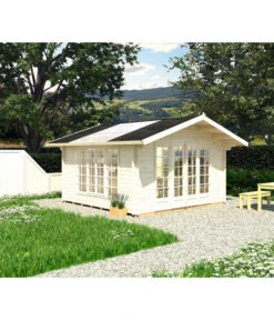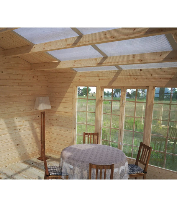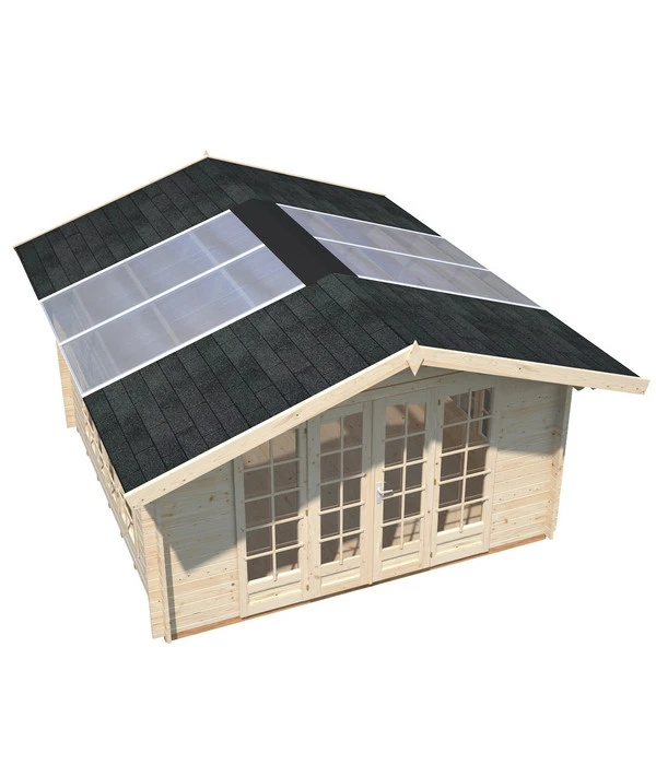 Das ästhetisch ansprechende Gartenhaus Irene besteht aus stabilen Blockbohlen mit winddichten Chaletschnitt-Eckverbindungen. Dank der hohen Doppeltür ist das Hineinbringen von Möbeln kein Problem. Nutzen Sie das Palmako Gartenhaus Irene als ruhigen Rückzugsort, für gesellige Runden oder für kreatives Arbeiten. Der lichtdurchflutete Innenraum ist bestens als Homeoffice geeignet. Halbtransparente Doppelstegplatten auf dem Dach sorgen für zusätzliche Helligkeit. Machen Sie es sich im Gartenhaus Irene gemütlich. Für eine behagliche Sitzgruppe, eine bequeme Schlafcouch und einen Tisch ist ausreichend Platz. Entscheiden Sie sich jetzt für das Gartenhaus Irene von Palmako und bestellen Sie die Dacheindeckung sowie einen Schutzanstrich gleich mit dazu.