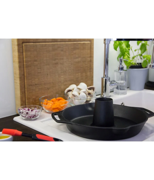 Lieben Sie, Ihre Familie und Ihre Bekannten auch unwiderstehliches Geflügelfleisch vom Grill, wenn Sie die warmen Sommerabende oder das Wochenende zusammen verbringen? Dann kreieren Sie mit dem Geflügelbräter von Petromax Ihre eigenen Lieblingsrezepte für außen knusprige, aber innen saftige Hähnchen vom Grill. Die Antihaft-Oberfläche erlaubt es Ihnen, den Bräter auszupacken und sofort loszulegen. Zudem sorgt er dafür, dass sich die Hitze optimal verteilt, damit das Geflügelfleisch gleichmäßig gar ist. Gießen Sie das überschüssige Fett bequem über die seitlichen Vorrichtungen aus. Für ein ganz besonderes Aroma geben Sie dem Gericht etwas Bier oder Wein und Kräuter bei.