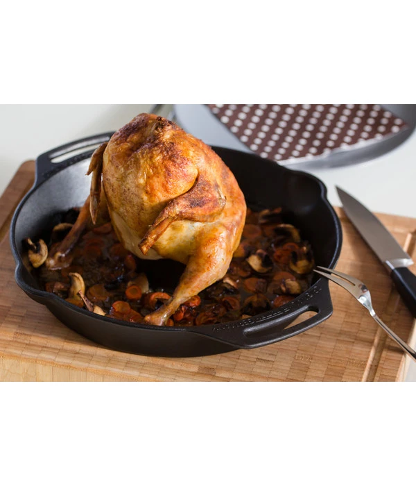 Dank der zwei Griffe servieren Sie Ihre Kreation direkt im Geflügelbräter auf den Esstisch. Stellen Sie den Bräter beispielsweise auf ein Holzbrett und zerlegen Sie das leckere Hähnchen direkt vor Ihren Gästen. Wenn Sie Ihre Liebsten also mit einem exquisiten Hähnchen überraschen wollen, von dem sie noch lange schwärmen, bestellen Sie den Petromax Geflügelbräter.