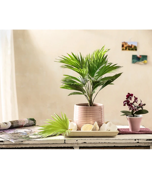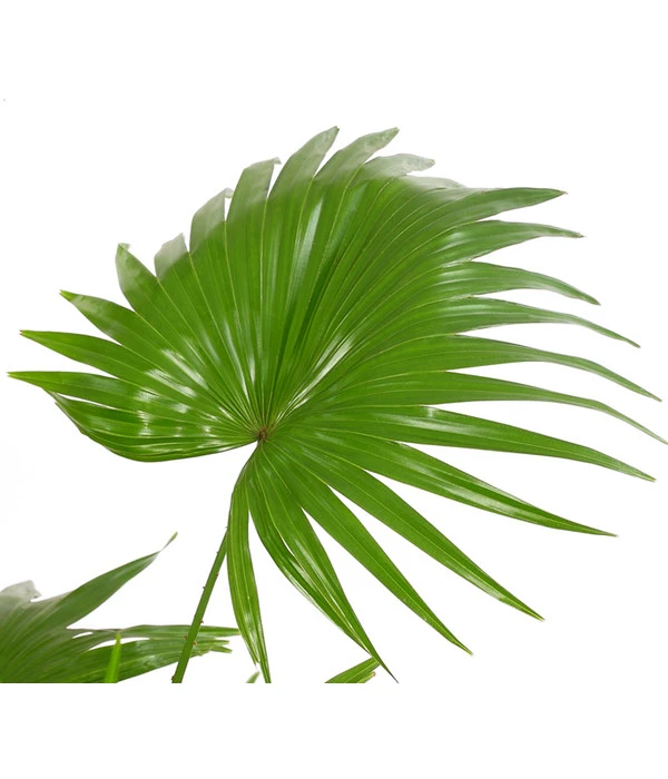 Ürsprünglich ist die Livistona im asiatischen Raum und in Australien beheimatet. Sie zählt zwar eigentlich zu den langsam wachsenden Fächerpalmen, kann aber durchaus Höhen von bis zu 15 Meter erreichen. Doch keine Angst ein Breitenwachstum müssen Sie vorerst nicht befürchten, im Zimmer bleibt die Rundblättrige Schirmpalme meist auch recht klein. Trotz allem vermittelt Sie uns mit ihren kreisrunden, gefiederten Blättern ein Gefühl von Sonne, Meer und Urlaub. Diese großen sattgrünen Blätter sind bis etwa zwei Drittel zusammengewachsen und stehen steif über den bedornten Stielen. Beim genaueren Hinsehen erkennt man, weshalb man sie auch oftmals nur Fächerpalme nennt. Könnte man doch nun selbst am Strand liegen, in der linken Hand einen Cocktail und zur Rechten einen Bediensteten, der einem mit einem Blatt der Schirmpalme einen leichten Wind zu fächert. Welch Glück das man dieses Feeling aufgrund der Zimmerpalme nicht missen muss.