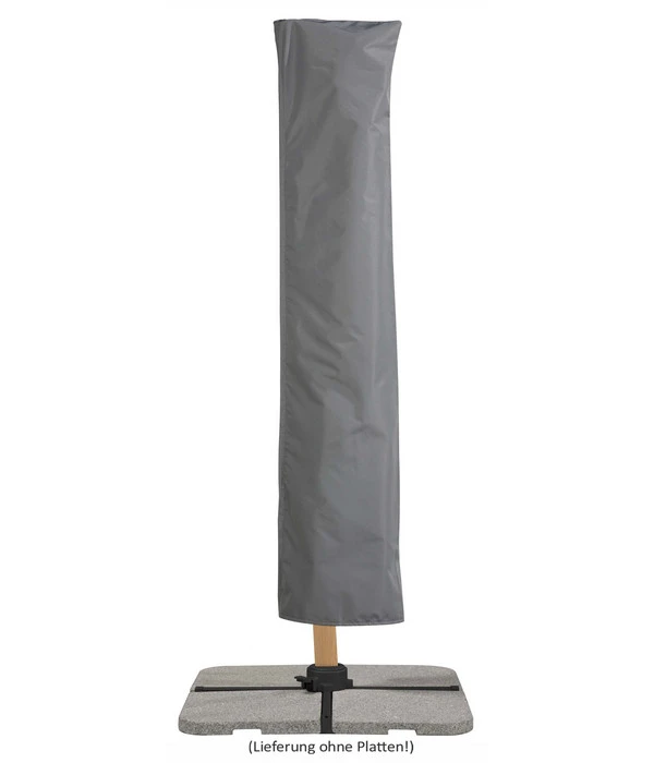 Die Bespannung besteht beim Schneider Ampelschirm Rhodos Twist Woody aus einer robusten Polyesterqualität mit einem Stoffgewicht von 200 g/m², die außerdem wasserabweisend imprägniert und verrottungsfest ist. Und Sie und Ihre Familie mit einem UV-Schutz von 50+ vor den gefährlichen UV-Strahlen schützt. Bei Bedarf lässt sich der Bezug abnehmen und per Hand waschen. Sie erhalten den Schirm inklusive Schutzhülle und Plattenständer, den Sie mit 50 x 50 cm Wegplatten füllen können.