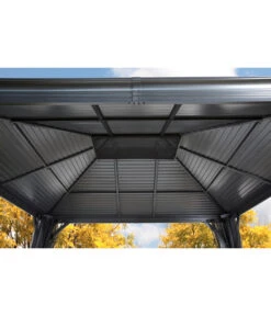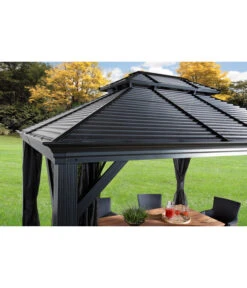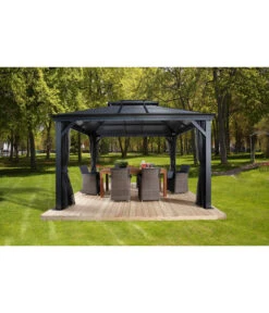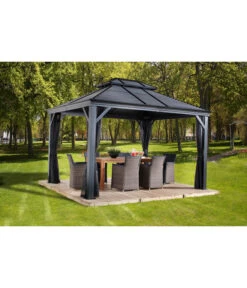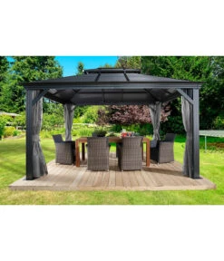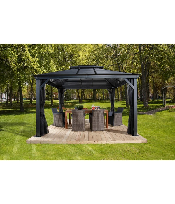 Der Sojag Pavillon Mykonos besteht aus einer massiven Konstruktion aus rostresistentem, pulverbeschichtetem Aluminium mit einer Pfostenstärke von 12 cm. Da auch die Schrauben aus rostfreiem Edelstahl sind, müssen Sie Ihr Wohnzimmer im Grünen für den Winter nicht abbauen. Selbst wenn der Winter besonders schneereich werden sollte, können Sie sich auf die außergewöhnliche Schneelast des Daches von 150 kg/m² verlassen. Die integrierten Regenrinnen sorgen für einen geregelten Abfluss von Regenwasser. Sie erhalten den Gartenpavillon inklusiv Moskitonetzen aus beschichtetem PVC und zweigleisigen Laufschienen, sodass Sie zusätzlich noch Vorhänge anbringen können, die Sie vor kühlem Wind oder neugierigen Blicken schützen. Die Vorhänge in elegantem Dunkelgrau sind separat als Zubehör erhältlich.