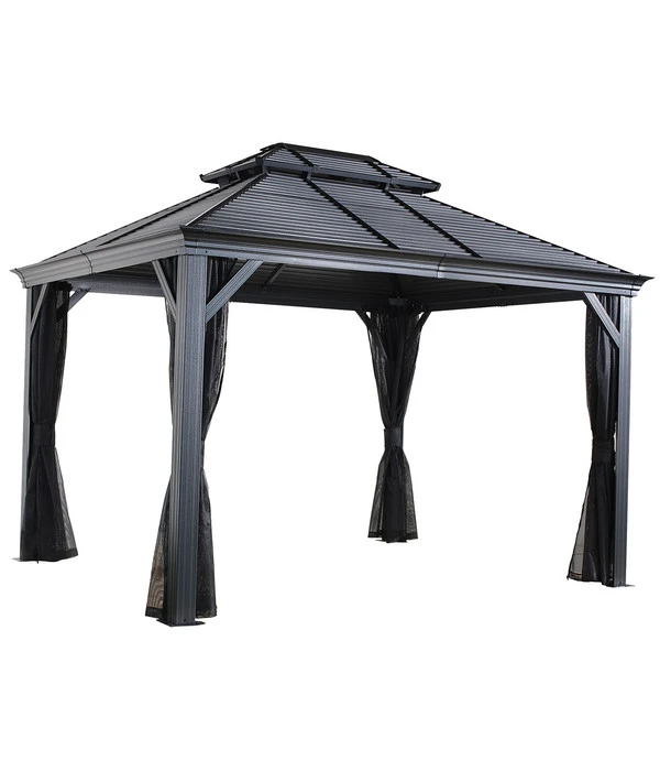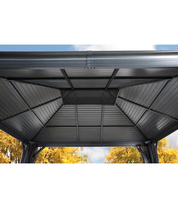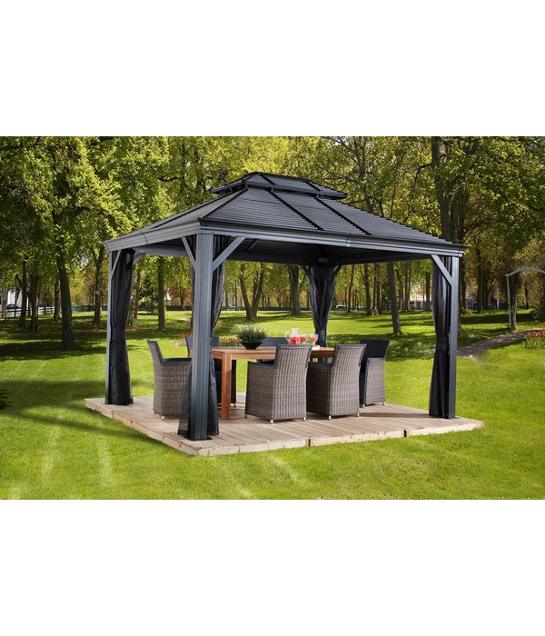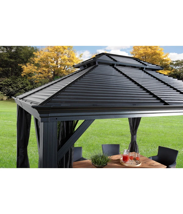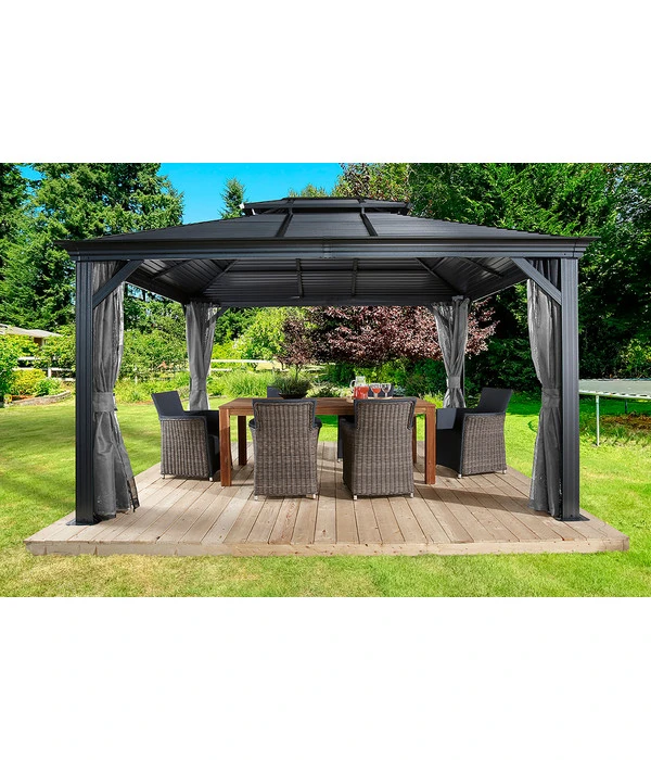 Wussten Sie, dass die ersten Gartenpavillons schon im Barock errichtet wurden, wo sie in lauschigen Parkecken Gelegenheit zum amourösen Tête-à-Tête boten? Der Sojag Pavillon Mykonos präsentiert sich zwar in einem modernen Design, doch ein bisschen von dem romantischen Flair ist auch in ihm noch zu spüren. Das liegt an der stabilen Konstruktion und dem doppelten Dach, für das anstelle von Kunststoffplatten oder Stoff langlebiger und beständig formschöner Stahl verwendet wurde. Das Material garantiert eine lange Lebensdauer wie bei den historischen Vorbildern aus Schmiedeeisen, während die Doppelung den Luftaustausch fördert und so einem Hitzestau vorbeugt. Genießen Sie bald das wunderbare Gefühl, mitten in der Natur und zugleich vor Sonne, Hitze und Regen geschützt zu sitzen – im Sojag Pavillon Mykonos!