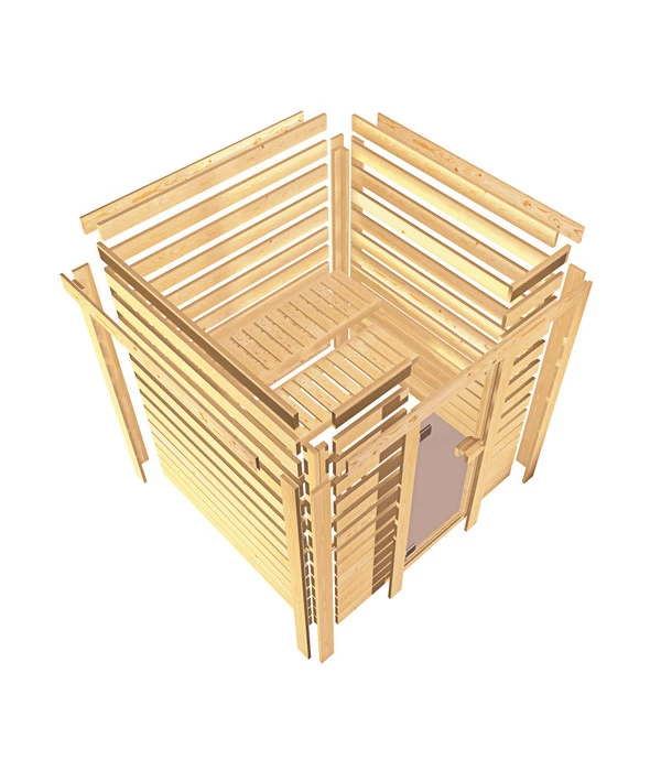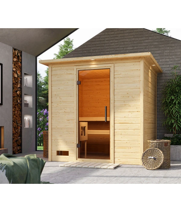 Immer mehr Menschen entdecken die Vorzüge des gesunden Schwitzens und erleben voll Freude, wie bei der regelmäßigen Auszeit in der Sauna Körper und Geist entspannen und die Akkus wieder aufgeladen werden. Aber immer mehr Menschen fühlen sich nicht wohl, wenn sie sich auf engstem Raum mit anderen befinden. Die Lösung liegt auf der Hand: eine eigene Sauna. Vielleicht haben Sie noch Platz im Badezimmer oder nehmen ein leerstehendes Kinderzimmer oder einen Kellerraum und richten sich dort eine eigene Sauna ein. Zum Beispiel mit der Wolff Finnhaus Innensauna Basic Zino. Wie das Wort Basic schon andeutet, hat dieses Modell keinen überflüssigen Schnickschnack, aber eine solide Grundausstattung, sodass Sie beim Saunieren auf nichts verzichten müssen. Und natürlich lässt auch die gute Material- und Verarbeitungsqualität keinen Wunsch offen. Bestellen Sie deshalb gleich zur Wolff Finnhaus Innensauna Basic Zino einen passenden Saunaofen und schon bald können Sie sich den täglichen Stress wegschwitzen!