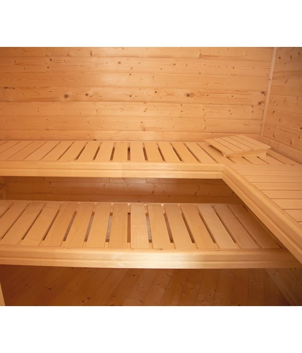 Die Wolff Finnhaus Innensauna Basic Zino ist eine klassische Elementbau-Sauna, die im Doppelnut- und Feder-System errichtet wird – für höchstmögliche Formstabilität und Abdichtung. Das Dach ist bereits vormontiert und mit einer 42 mm Mineralwolldämmung und Innenverkleidung aus Fichten-Profilholz versehen. Für die vormontierten Bänke, das Ofenschutzgitter und den Bodenrost wurde massives Espenholz gewählt. Diese Pappelart zeichnet sich durch eine besonders feine, glatte Oberfläche aus, die Sie gut reinigen können und die nicht unangenehm heiß wird, wenn Sie sich bei den Saunagängen darauf entspannen.